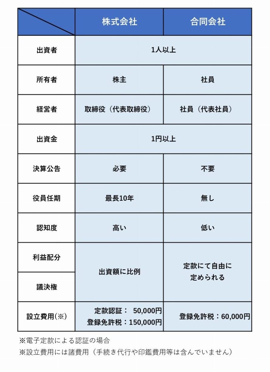 株式会社と合同会社の主な違いを表にまとめてみました。